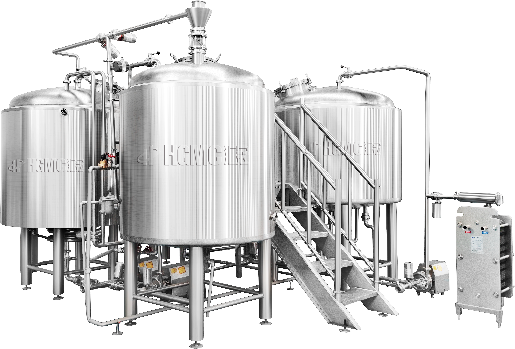 四器則是糖化在糖化罐、過濾在過濾槽、煮沸有煮沸鍋、漩沉在漩沉罐中分步進(jìn)行,額外配備了板式換熱器和冷熱水罐,增加了工作效率??梢赃M(jìn)行連續(xù)多批次生產(chǎn),一天可以生產(chǎn)2-6個(gè)批次的啤酒。
